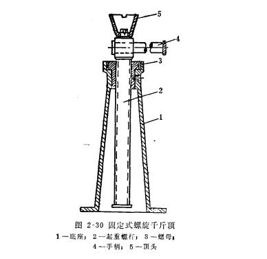 螺旋千斤顶的结构,见图2-30。这是一种简单的螺旋式千斤顶,它是由带螺母的底座、起重螺杆、顶托重物的顶头和转动起重螺杆的手柄等几个部分组成。