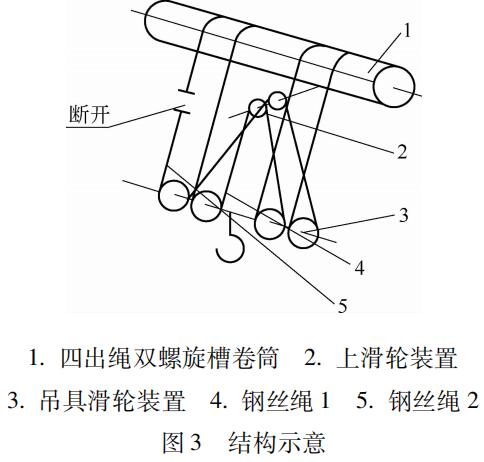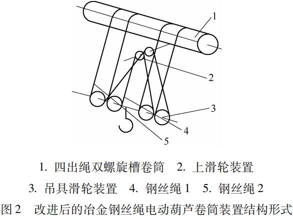 (1)、改进后的冶金钢丝绳电动葫芦卷筒装置结构形式如图2所示。结构主要由四出绳双螺旋槽卷筒、上滑轮装置、吊具滑轮装置、钢丝绳1、钢丝绳2组成。