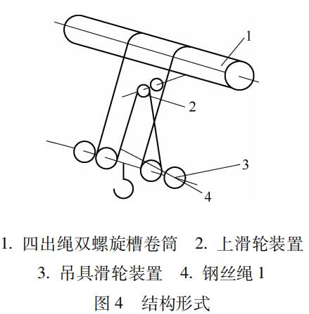 3、电动机通过驱动减速器带动四出绳双螺旋槽卷筒装置的卷筒旋转,缠绕卷筒上的钢丝绳,经过上滑轮装置、吊具滑轮装置使吊载起升或下降。其工作形式与普通钢丝绳电动葫芦起升机构提升装置相同。