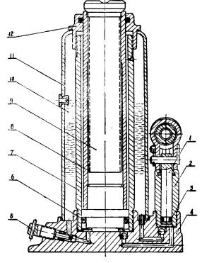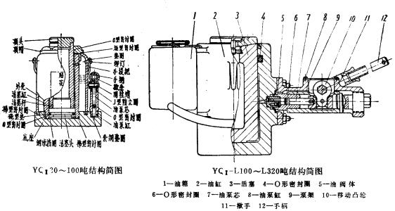 结构及工作原理:本产品由活塞、油缸、油泵、底座、外套、顶帽等主要零件组成,利用液压原理,以手掀动油泵将油压入活塞底部,使其升起,从而达到起重的目的。