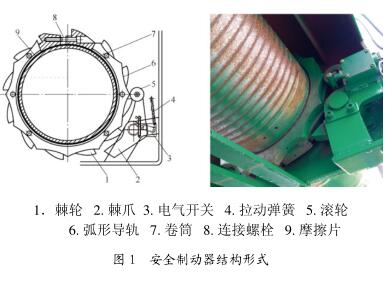 钢丝绳电动葫芦通常采用带制动装置的锥形转子电动机,其制动原理是:电机不工作时,弹簧产生轴向推力,使制动环紧压在制动器端盖上,整机处于制动状态。电机通电工作时,锥形转子产生的轴向磁拉力克服弹簧的轴向推力,使转子轴向移动,制动轮上的制动环脱离制动器端盖,电机旋转带动卷筒旋转钢丝绳实现升降功能。对钢丝绳电动葫芦,只有一个工作制动器存在潜在风险:起升机构在提升负载过程中如出现制动力矩不足或传动环节失效,将发生失速溜钩现象,引发安全事故。为满足更高的安全需求,钢丝绳电动葫芦制造商在传动环节末端即卷筒上设置了棘轮棘爪机构作安全制动器,当电动葫芦超速下降时触发棘爪与棘轮啮合,实现卷筒的减速制停。