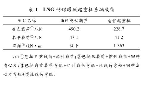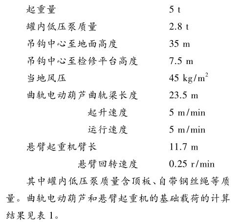 其中罐内低压泵质量含顶板、自带钢丝绳等质量。曲轨电动葫芦和悬臂起重机的基础载荷的计算结果见表 1。