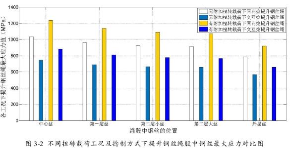 (3)由于扭转载荷的存在,无论提升钢丝绳有无附加扭转载荷,或采用那种捻制方式,其内部绳股中的各钢丝都是呈现由外到内应力逐渐增大,中心处钢丝应力最大的规律。