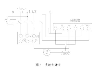 3)由交流电源供电,由整流模块转换为直流电给制动器供电。通常情况下,制动器连接交流侧开关,与电动机同时得电、同时失电,通过电动机开关控制,交流侧开关控制如图3所示;为了实现快速制动,一般采用直流侧开关,直流侧开关控制直接有电控控制,与电动机之间独立控制,可以实现与电动机之间的时序控制,直流侧开关的吸合时间比交流侧吸合时间快约6 ~10倍。直流侧开关如图4所示。整理模块一般分为半波整流器、全波整流器和过励磁整流器,如需更快的响应时间,可选用过励磁整流器,过励磁整流器与标准半波整流器相比,释放时间要比正常的半波整流器要短 50%,且制动器的耐磨损能力增加一倍,寿命延长;与标准全波争流器相比,制动时间缩短约30%, 发热量小,能耗降低约25%。