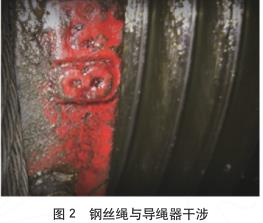 2)维保单位在更换钢丝绳时,未对新钢丝绳进行应力消除,故钢丝绳内部存在着扭转应力,在导绳器与钢丝绳配合不良的情况下,加大了钢丝绳脱离卷筒绳槽的可能性。