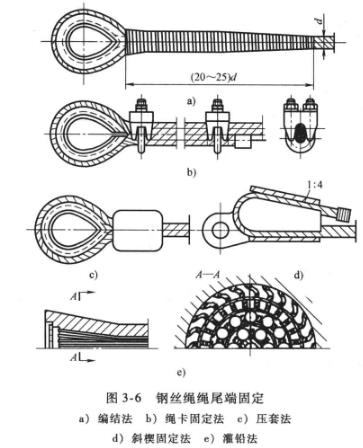 2)绳端部位检查。绳端固定连接部位的安全可靠性对起重机械的安全是十分重要的,绳端部位应做如下安全检查:①从固定端引出的那段钢丝绳应进行检查,因为这个部位发生疲劳断丝或腐蚀都是极其危险的;②对固定装置的本身变形或磨损也应进行检查;③对于采用压制或锻造绳箍的绳端固定装置应检查是否有裂纹及绳箍与钢丝绳之间是否有产生滑动的可能;④检查绳端可拆卸的樱形接头、绳夹、压板等装置内部和绳端内的断丝及腐蚀情况,以确保绳端固定的紧固可靠性;5检查编制环状插口式绳头尾部是否有突出的钢丝伤手。如果绳端固定装置附近或绳端固定装置内有明显断丝或腐蚀,可将钢丝绳截短再重新装到绳端固定装置上,且钢丝绳的长度应满足在卷筒上缠绕的最少两圈要求。