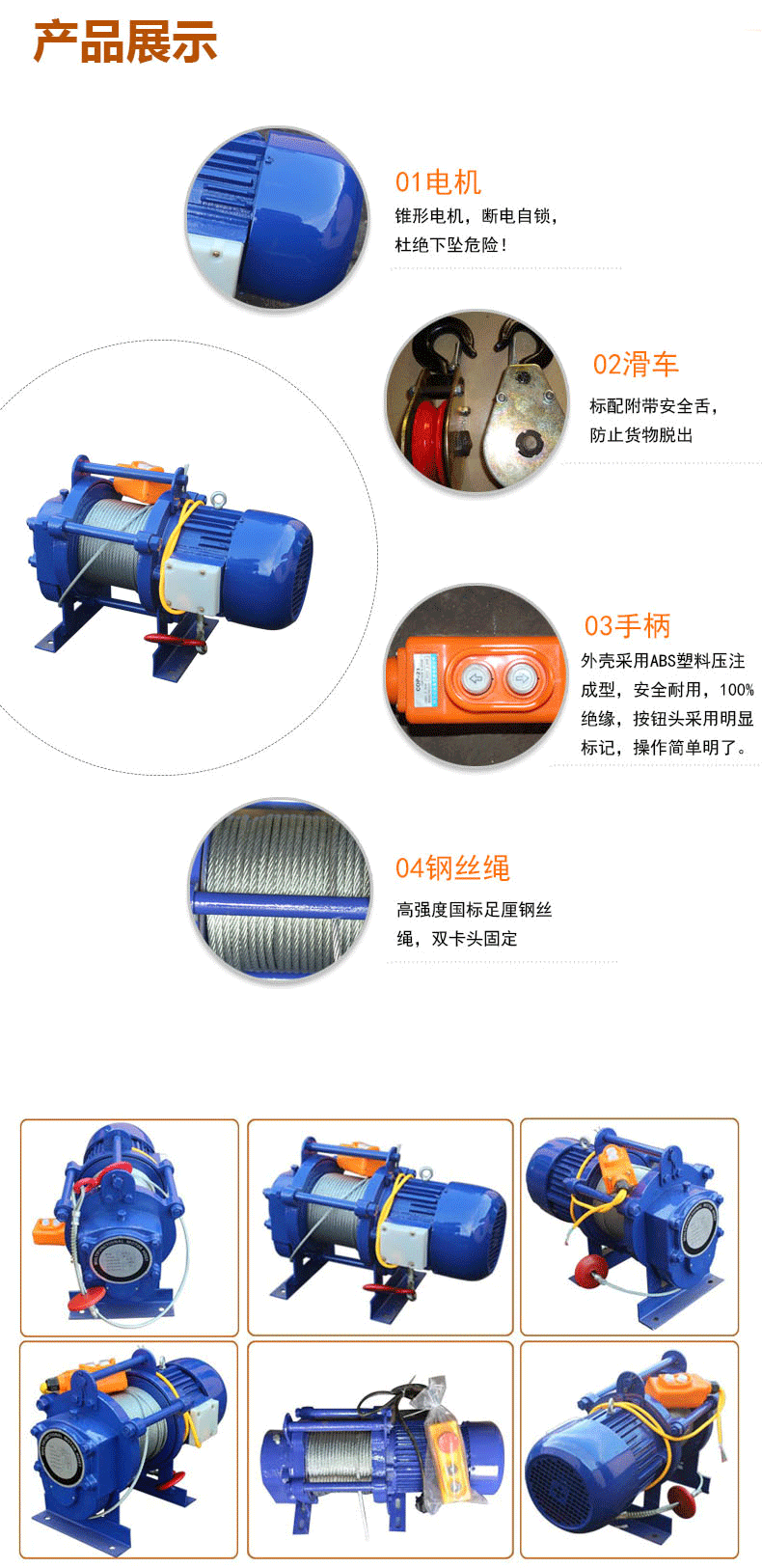 多功能电动提升机紧凑型设计,安装方便;经济实惠,应用范围广。具有制动速度快,体积小,重量轻,结构紧凑,使用方便,维修简便的特点。