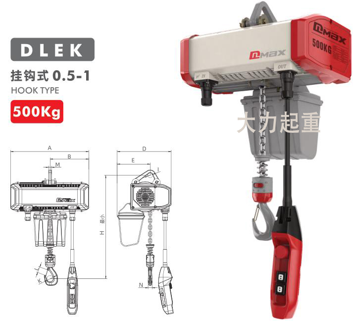 0.5吨DLEK环链电动葫芦挂钩式产品参数:
